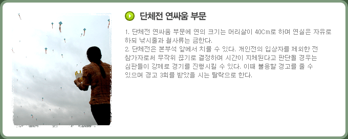 본 경기는 1) 개인전 연싸움 부문, 2) 단체전 연싸움 부문, 3) 창작연날리기 부문, 4) 중,고등학교 단체전 연날리기 부문,