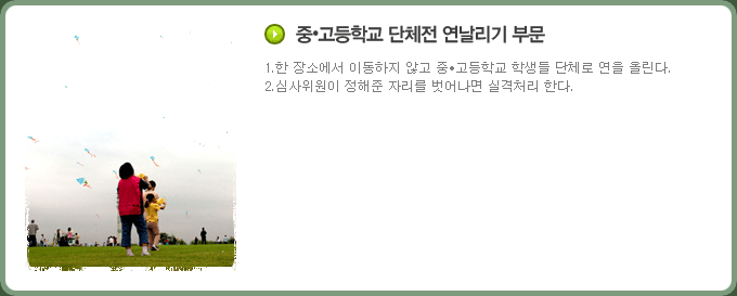 5)중학교단체전연날리기부문, 6) 초등학교 단체전 연날리기 부문, 7) 고등학생 멀리연날리기 부문,