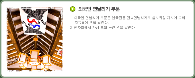 8) 중학생 멀리연날리기 부문, 9) 초등학생 멀리연날리기 부문, 10) 외국인 연날리기 부문 총 10개 부문으로 대회를 실시합니다.