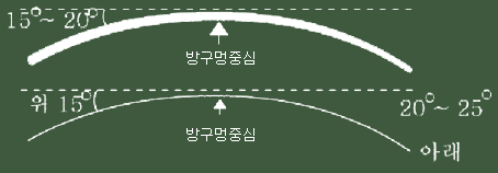 활꼴로 휘어져야 하고 각도가 약 15° ~ 20° 일 때가 좋다. |